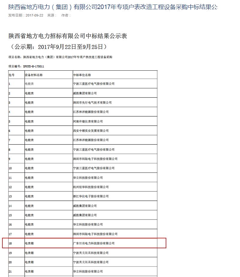 2017年專項戶表改造工程設(shè)備采購項目中標結(jié)果公示表