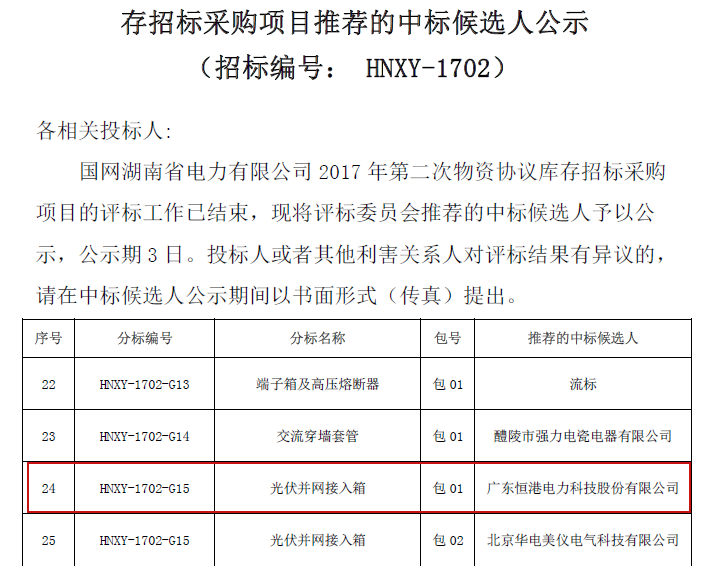 國網(wǎng)湖南省電力有限公司2017年第二次物資協(xié)議庫存招標(biāo)采購項目(招標(biāo)編號:HNXY-1702)項目推薦的中標(biāo)候選人公示