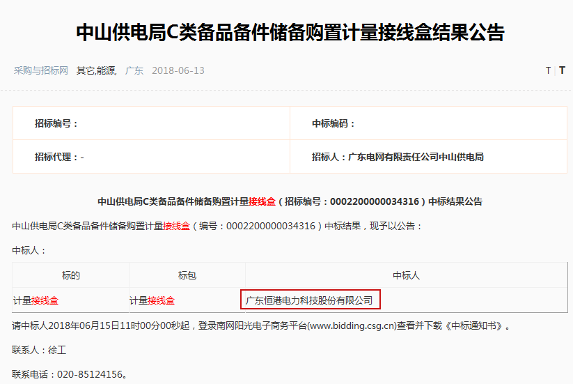 中山供電局C類備品備件儲備購置計(jì)量接線盒中標(biāo)結(jié)果公告