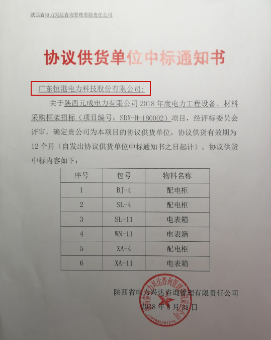 熱烈祝賀我司在陜西元成電力有限公司2018年度電力工程設(shè)備、材料采購(gòu)框架招標(biāo)項(xiàng)目中標(biāo)