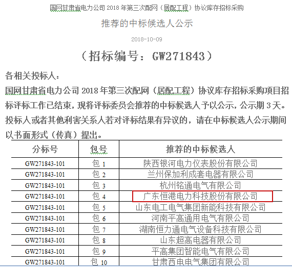 熱烈祝賀我司在國網(wǎng)甘肅省電力公司2018年第三次配網(wǎng)(居配工程)協(xié)議庫存招標(biāo)采購項目中標(biāo)