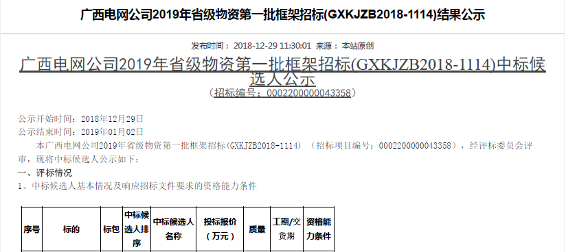 熱烈祝賀我司在廣西電網(wǎng)公司2019年省級物資第一批框架招標(GXKJZB2018-1114)中標