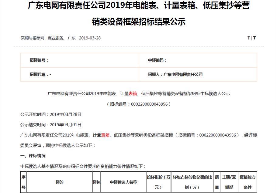 熱烈祝賀我司在廣東電網(wǎng)有限責(zé)任公司2019年電能表、計量表箱、低壓集抄等營銷類設(shè)備框架招標(biāo)中標(biāo)