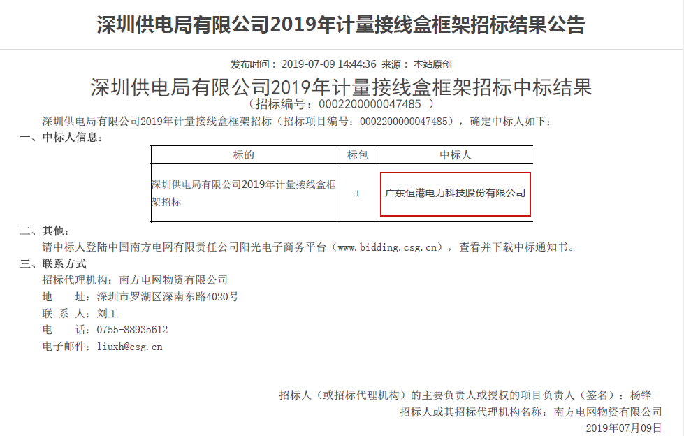 熱烈祝賀我司在深圳供電局有限公司2019年計(jì)量接線盒框架招標(biāo)中標(biāo)