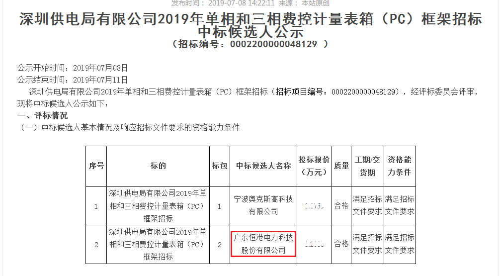 熱烈祝賀我司在深圳供電局有限公司2019年單相和三相費(fèi)控計(jì)量表箱(PC)框架招標(biāo)中標(biāo)???????