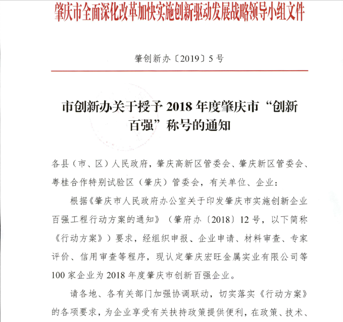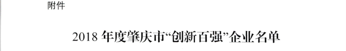 熱烈慶祝我司榮獲2018年度肇慶市“創(chuàng)新百強”稱號