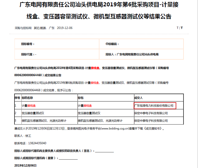 熱烈祝賀我司在廣東電網(wǎng)有限責(zé)任公司汕頭供電局2019年第6批采購項目-計量接線盒、變壓器容量測試儀、微機(jī)型互感器測試儀等結(jié)果中標(biāo)