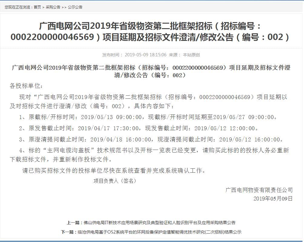 廣西電網(wǎng)公司2019年省級(jí)物資第二批框架招標(biāo)(招標(biāo)編號(hào):0002200000046569)項(xiàng)目延期及招標(biāo)文件澄清/修改公告(編號(hào):002)