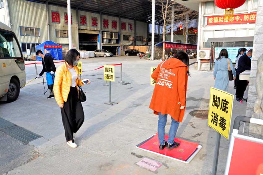 The soles of shoes are disinfected to prevent viruses from entering the door